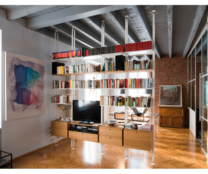 Los montantes verticales de aluminio fijados por presión entre el suelo y el techo, combinados con estantes y diferentes tipos de contenedores, permiten crear soluciones de decoración adecuadas para cada estancia de la casa, desde la zona de estar hasta el dormitorio, la oficina o los espacios de exposición. como tiendas y salas de exposición.