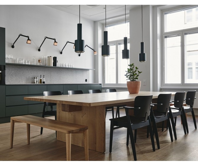 Esta elegante lámpara colgante recibe el sobrenombre de "Granada de mano" por su forma distintiva. Compuesto por una pantalla de acero lacado y un anillo interior, la lámpara colgante A110 proporciona una calidad de luz excepcional en tonos cálidos. "Hand Grenade" proyecta luz directa e indirecta en los techos, y su anillo interior perforado crea un efecto de halo alrededor de la lámpara colgante y al mismo tiempo reduce el deslumbramiento. “Hand Grenade” fue diseñado para el edificio que Alvar Aalto creó para la Asociación de Ingenieros de Finlandia en 1952.